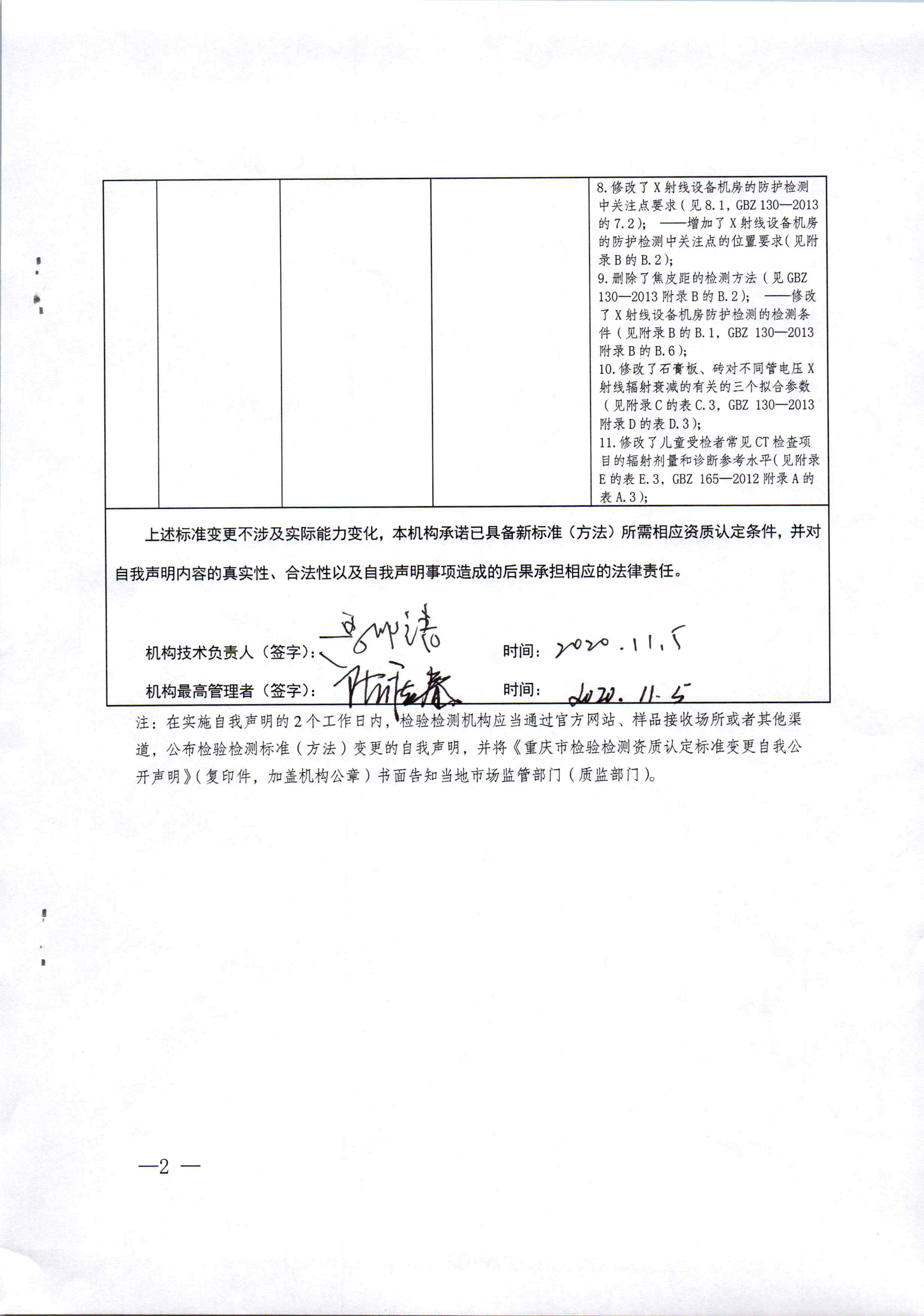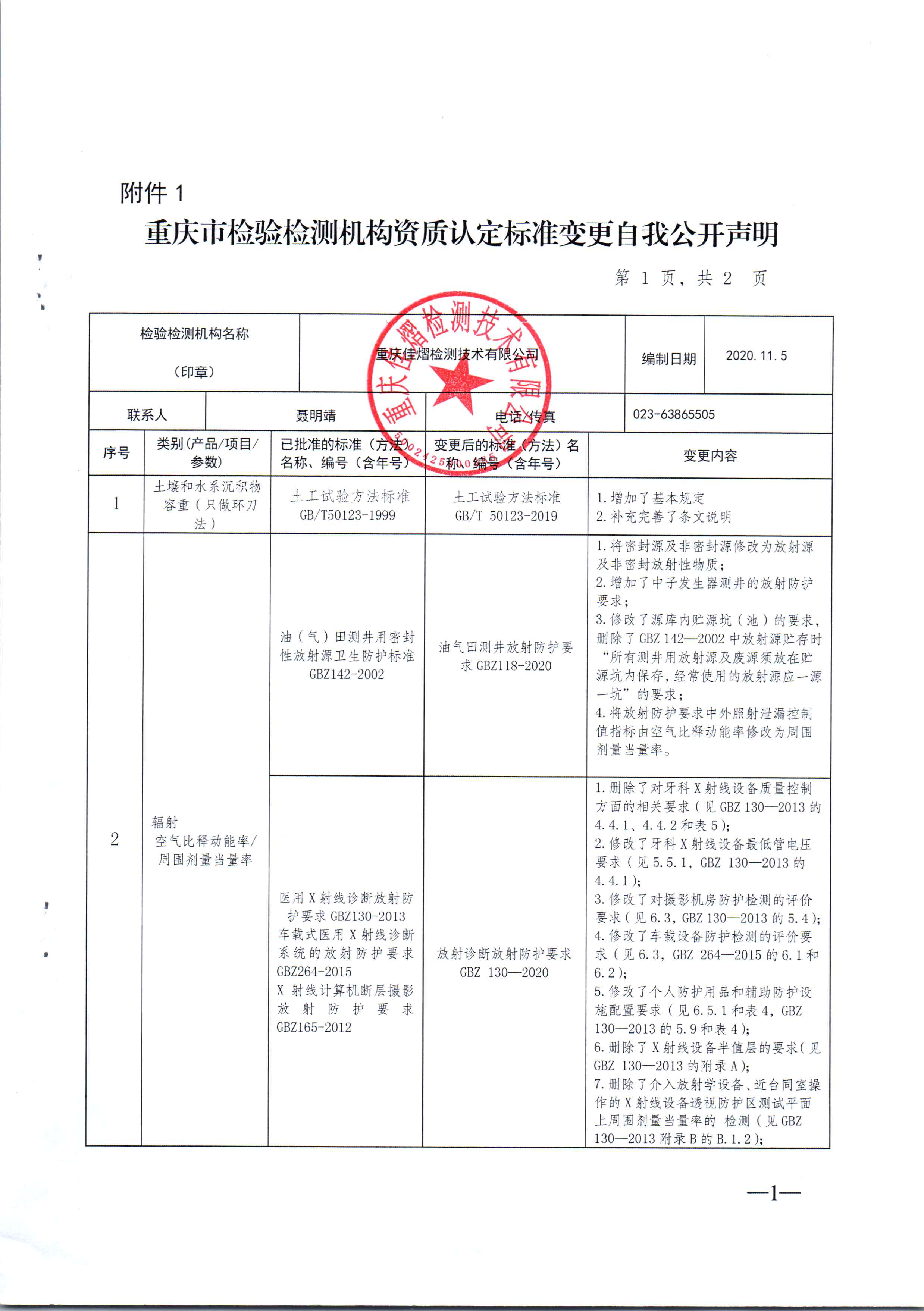 為貫徹落實(shí)《重慶市市場(chǎng)監(jiān)督管理局關(guān)于推行檢驗(yàn)檢測(cè)機(jī)構(gòu)資質(zhì)認(rèn)定標(biāo)準(zhǔn)變更模式改革試點(diǎn)的通知》(渝市監(jiān)發(fā)〔2019〕4號(hào))精神,現(xiàn)將本公司“土壤和水系沉積物 容重以及輻射空氣比釋動(dòng)能率/周圍劑量當(dāng)量率”標(biāo)準(zhǔn)變更聲明如下: