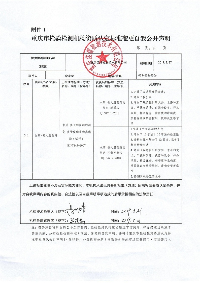 為貫徹落實《重慶市市場監(jiān)督管理局關(guān)于推行檢驗檢測機(jī)構(gòu)資質(zhì)認(rèn)定標(biāo)準(zhǔn)變更模式改革試點的通知》(渝市監(jiān)發(fā)〔2019〕4號)精神,現(xiàn)將本公司“水質(zhì) 糞大腸菌群的測定”標(biāo)準(zhǔn)變更聲明如下: